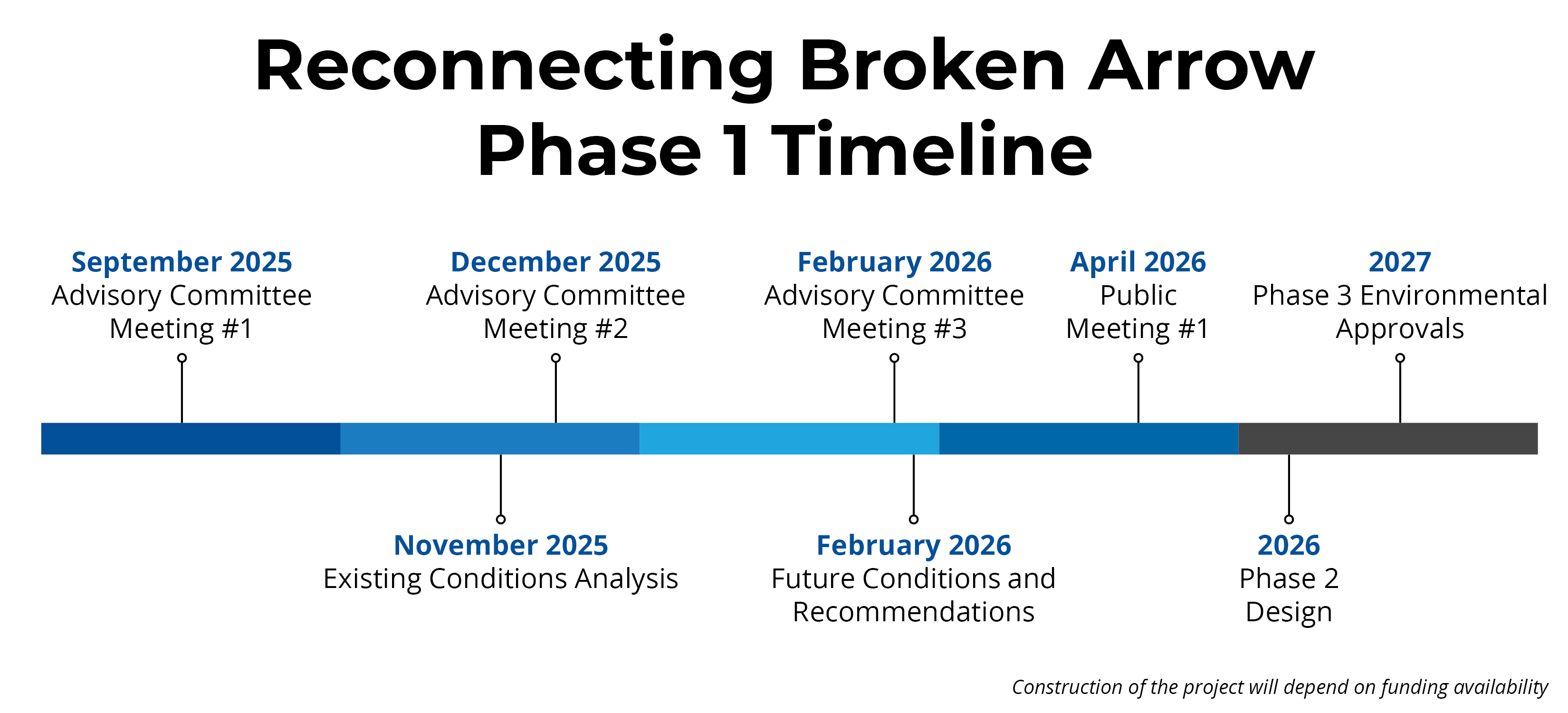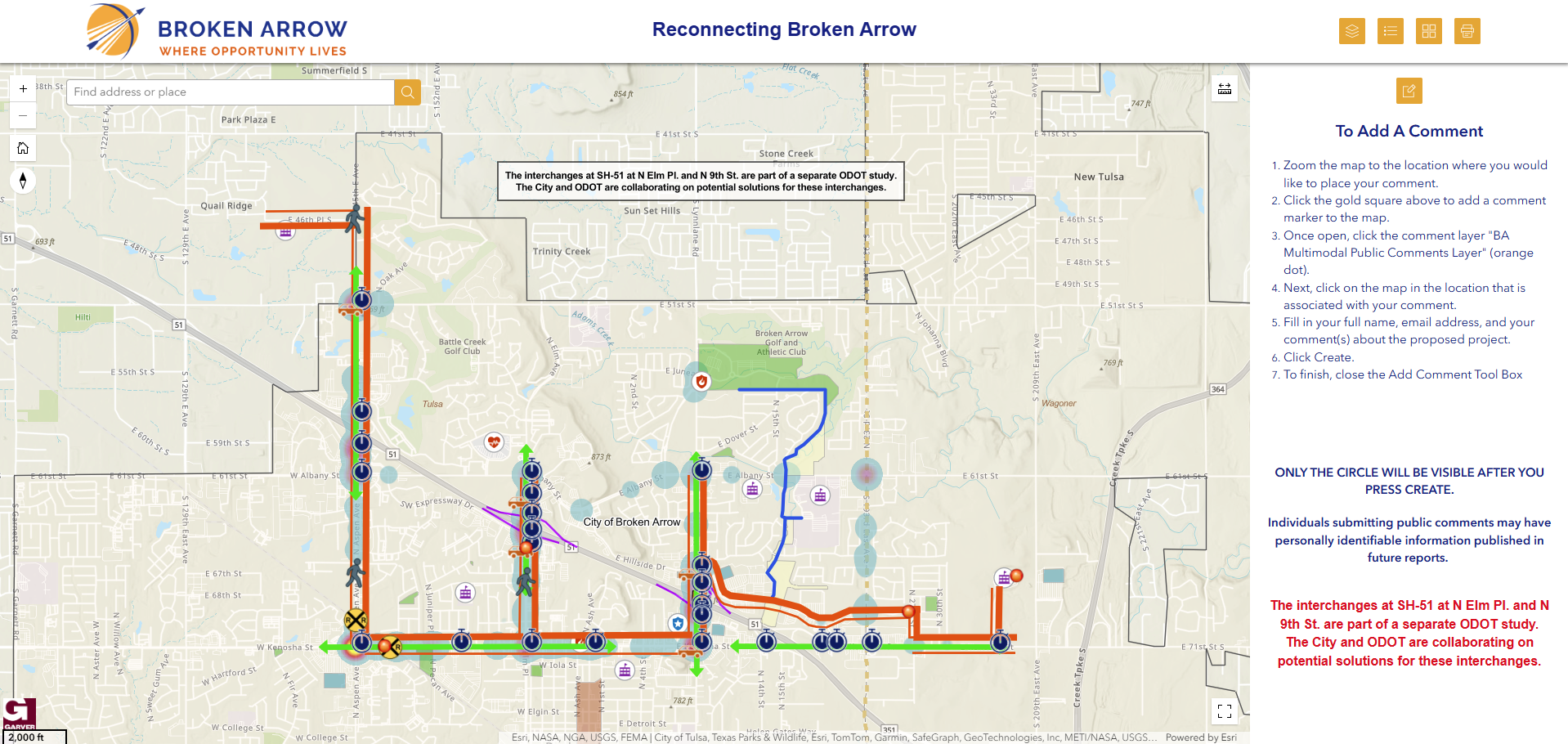Welcome to the project website for the City of Broken Arrow’s Reconnecting Broken Arrow project. In 2023, the City of Broken Arrow was awarded $5.84 million from the US Department of Transportation and matched it with $1.46 million in local funds to study and design a series of multimodal transportation connections throughout the city. Proposed improvements include additional vehicle lanes, intersection improvements, sidewalks, bicycle infrastructure, and a new off-street trail with amenities. The grant provides funding for planning and design; the City will be pursuing additional funding for construction.
