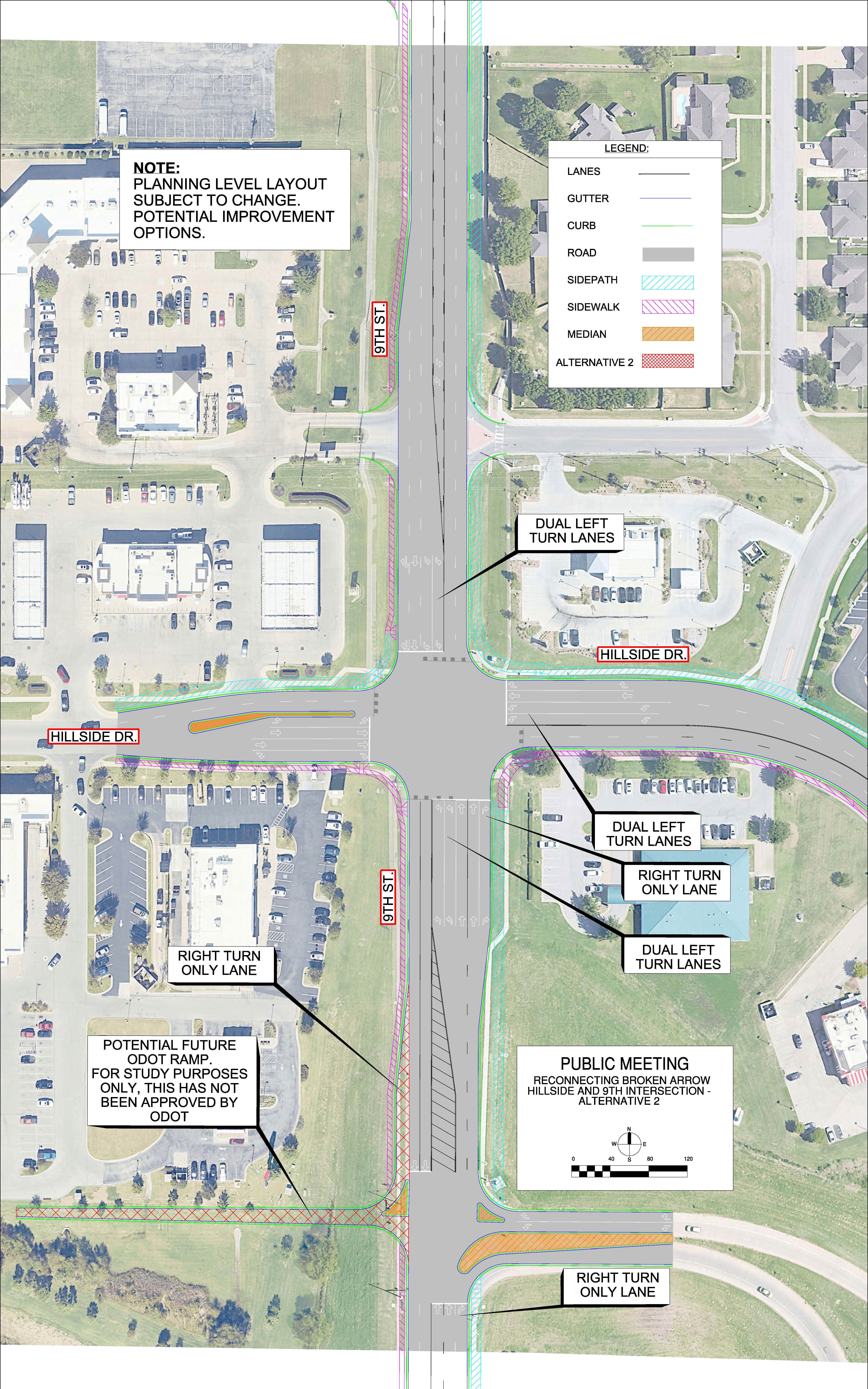 One improvement alternative was evaluated along Hillside Drive that focuses on improving bicycle and pedestrian connectivity between nearby neighborhoods and adjacent corridors.